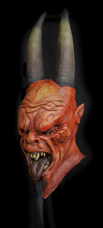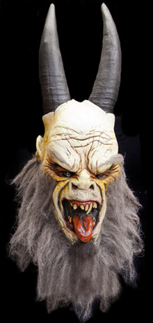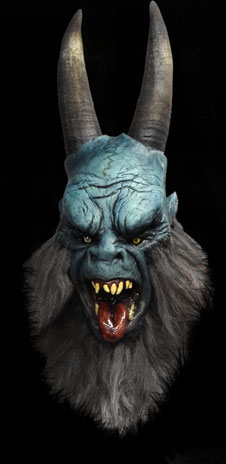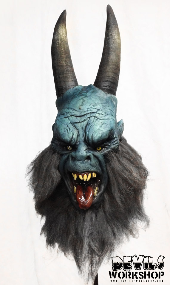 THE KRAMPUS MASK, RELEASED IN OCTOBER 2011, IS THE TALLEST MONSTER MASK TO EVER BE OFFERED BY THE DEVIL'S WORKSHOP MEASURING IN AT 30" IN HEIGHT. ALL COPIES ARE PULLED DIRECTLY FROM THE MASTER MOLD TO ENSURE SUPER FINE DETAILS. IN ADDITION, REAL GOAT HAIR IS USED TO FINISH OFF THIS IMPRESSIVE BEAST.