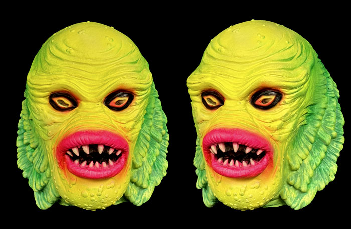AHHH, BUT THAT'S NOT ALL! THIS VILE VISAGE IS HAND-PAINTED WITH BLACKLIGHT-REACTIVE PAINTS, GLOWING WITH EERIE SHADES OF PUTRID YELLOW, VENOMOUS GREEN, AND GHASTLY PINK! DARE TO WEAR IT, AND WATCH IT COME ALIVE UNDER THE SICKLY GLOW OF THE ULTRAVIOLET! BEWARE, MORTALS… THE LAGOON’S HORROR NOW WALKS AMONG YOU!